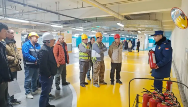 在施工工地层面,为加强建筑工地消防安全管理,王府井消防救援站创新工作机制,联合属地街道、派出所,通过定期会商、联合检查、协同培训等方式,实现资源共享与力量互补。消防救援站深入辖区在建工地开展消防安全培训,消防宣传员结合典型火灾案例,剖析施工工地常见隐患,并针对其环境复杂、人员流动大的特点,采取“理论讲解+实操演练”模式。培训重点涵盖初期火灾扑救、火场逃生自救及消防器材使用等技能,消防员现场“手把手”指导施工人员操作灭火器、连接消防水带,确保参训人员切实掌握基本防火灭火技能,为工地拧紧消防“安全阀”。