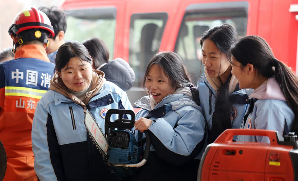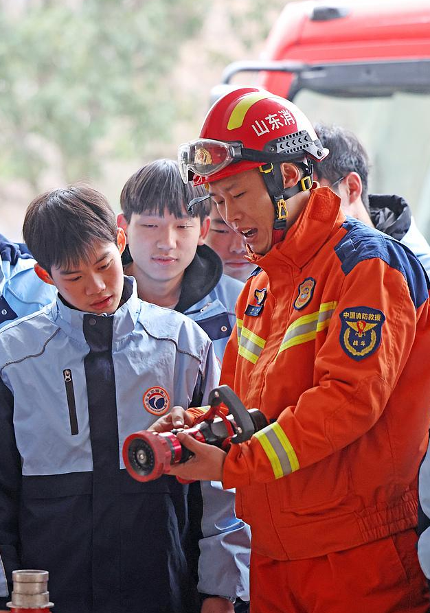 3月5日,山东临沂,郯城县第二中学开展“消防安全进校园”开学第一课活动,消防救援人员为学生讲解消防装备器材,加强安全教育,护航学生成长。