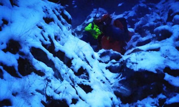 经过一整夜攀爬、跨越、滑降,救援队于1月18日9时30分在一处山坳中找到两名受伤被困者。队员发现,两名伤员情况虽相对稳定,但必须使用担架转运。“这在平地已是负重前行,在断崖交错、积雪没膝的险峻山岭中,更是对体力、技术与意志的终极考验。”救援队表示,抬运担架必须绝对平稳,尤其在通过断崖时,需采用绳索悬吊技术转运,每一个环节都关乎生死。为确保绝对安全,指挥部启动四梯队接力预案。