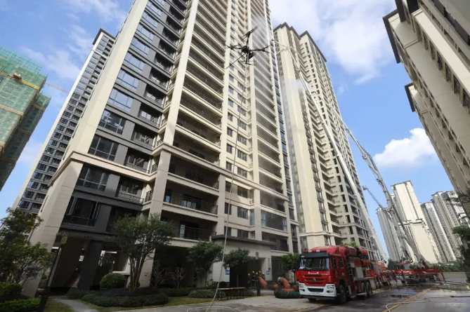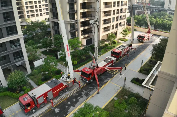 演练围绕高层建筑火灾供水保障难、深入内攻难、疏散救生难等特点,设置无人机侦查、现场警戒、人员疏散、外围堵截、飞火控制、火场破拆、内攻灭火、送风排烟、物资投送等16个实战科目。演练过程中各参演单位反应迅速、配合默契、分工明确,处置流程规范严谨,充分检验了队伍协同作战能力。