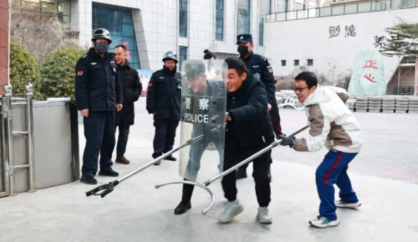 本次演练培训采用示范讲解、实操体验与情景模拟相结合的多元化方式。派出所民辅警结合多年的一线处突经验及校园安全工作的实际需求,聚焦防暴棍、约束叉、防暴盾牌等常用防护器材的规范使用,为学校安全负责人、安保人员带来了一场细致入微的实操教学。