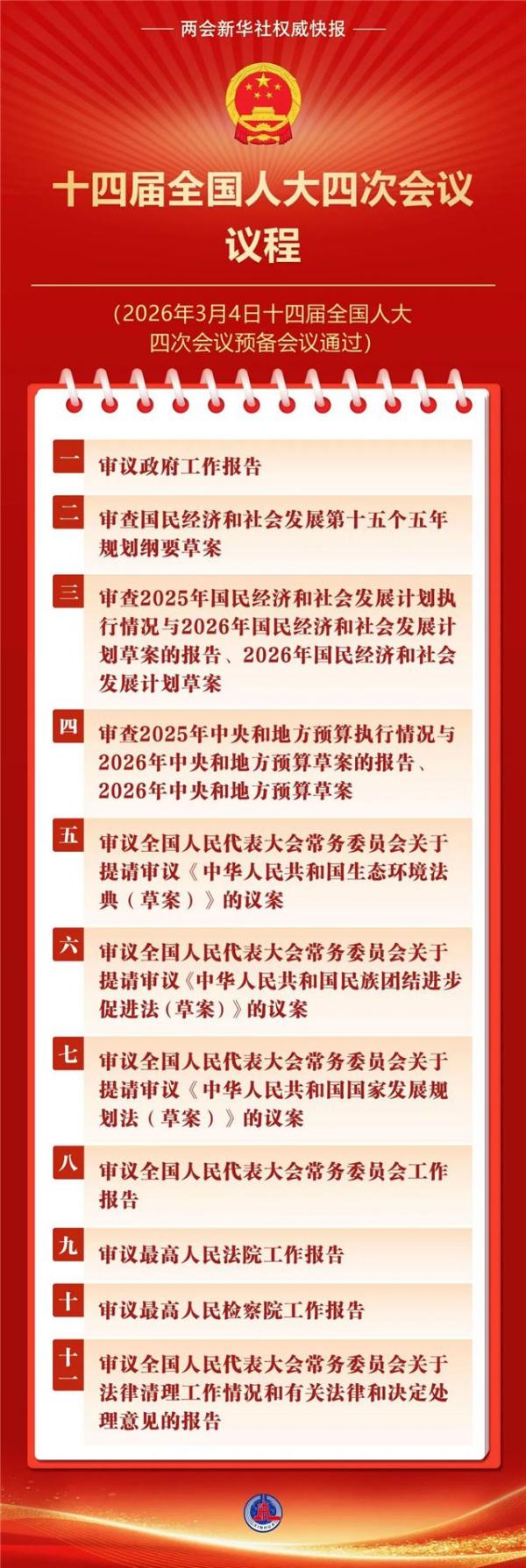 十四届全国人大四次会议3月4日(星期三)12时在人民大会堂新闻发布厅举行新闻发布会。大会发言人娄勤俭说,本次大会3月5日上午开幕,12日下午闭幕,会期8天。大会议程共有11项。大会的各项准备工作已全部就绪。