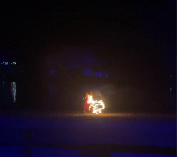 江苏一女子在动物园表演时被火圈烧着裙子,迅速跑向身后水池跳水自救
